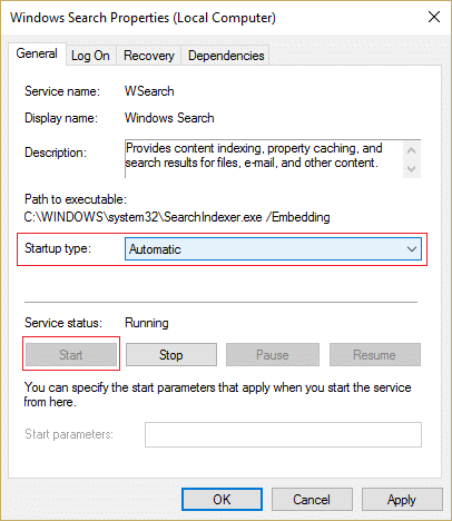 3. Asegúrese de establecer el Tipo de inicio en Automático y haga clic en Ejecutar si el servicio no se está ejecutando.
