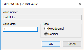 6.Haga doble clic en LimitUnits DWORD, luego seleccione Decima l en Base y cambie su valor de la siguiente tabla para tener un límite de cuota predeterminado que estableció en los pasos anteriores como KB, MB, GB, TB, PB o EB, y haga clic en Aceptar .