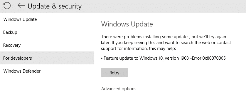 エラー0x80070005Feature Updates1903が続くかどうかを調べます。